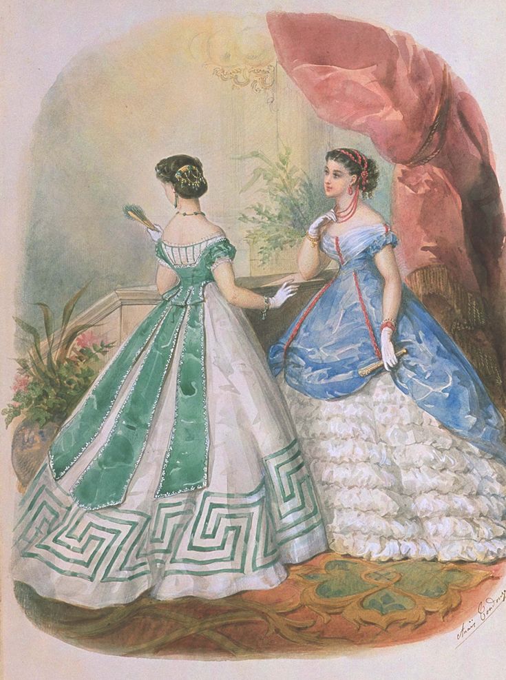 Pour les femmes, une robe de bal avec le jupon crinoline ou à tournure (décolletée et manches courtes).